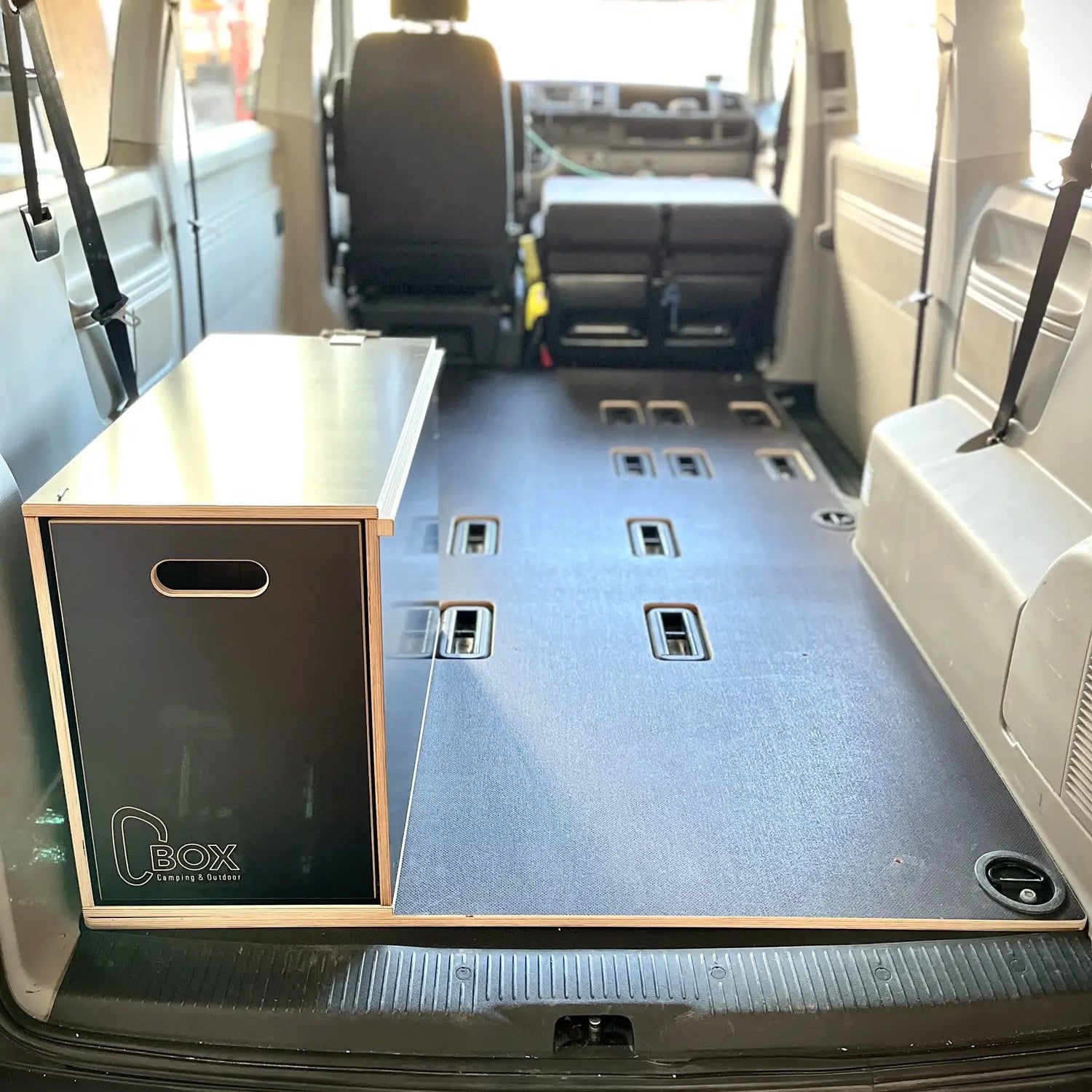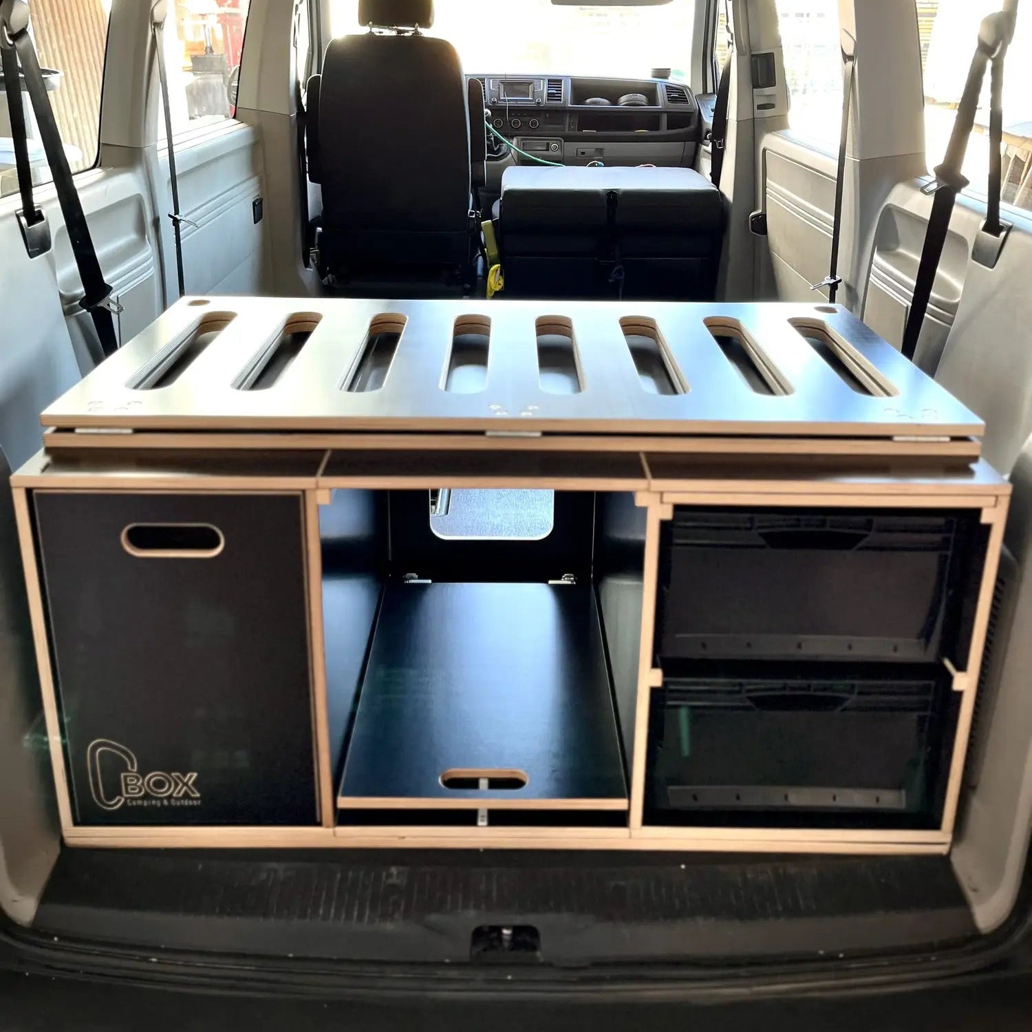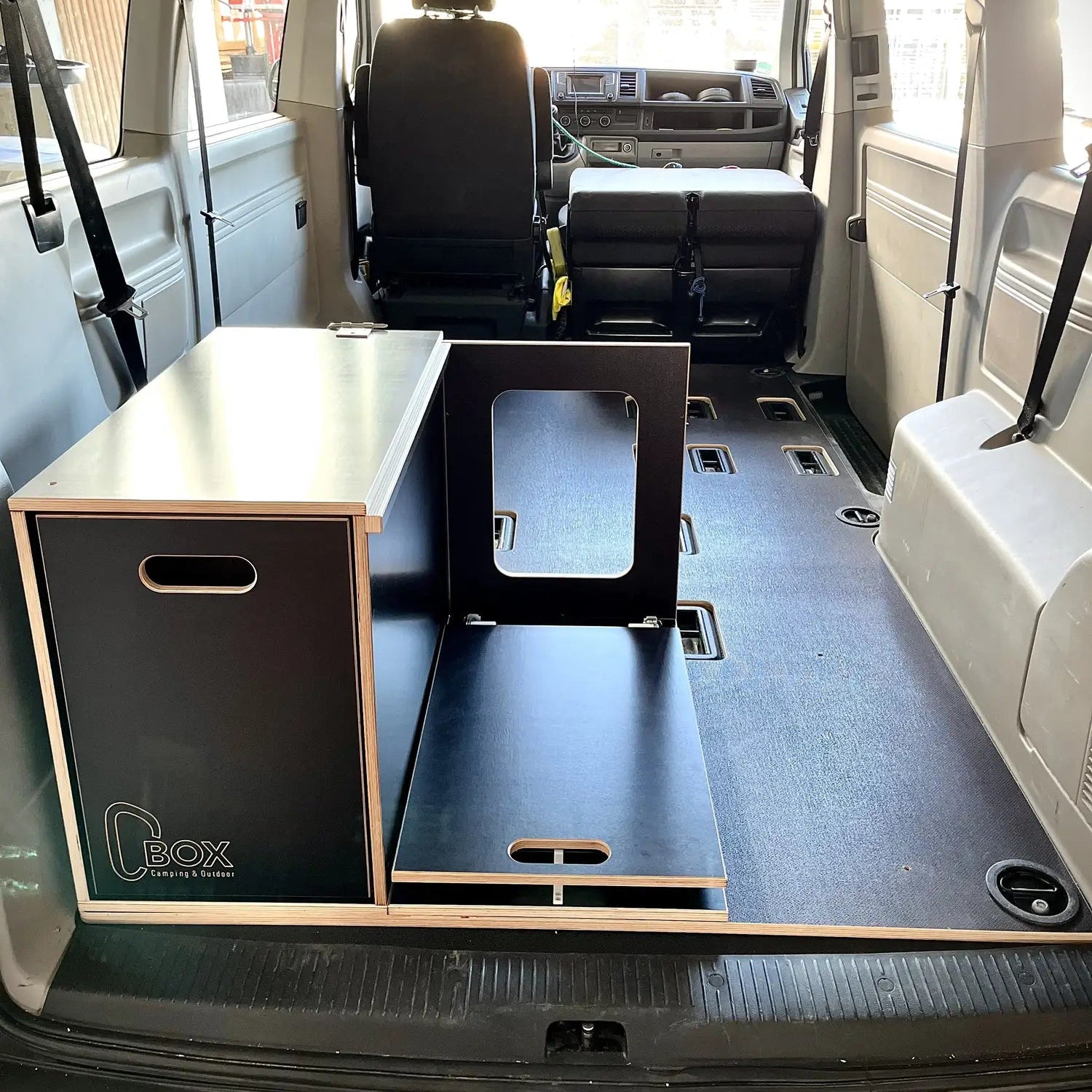 Die C-BOX kann im zusammengebauten Zustand in dein Fahrzeug ein- und ausgebaut werden. Hierzu ist es nur wichtig, dass der Boden mit Rückwand montiert und die Tischplatte eingelegt ist um die notwendige Stabilität beim Anheben der C-BOX zu gewährleisten.